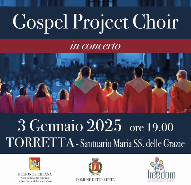 Gospel Project Choir in concerto nel Santuario Maria SS. delel Grazie, il 3 gennaio, dalle ore 19. Il coro multietnico, nato a Palermo nel dicembre del 1994 e formato da 44 elementi, di cui 24 solisti, eseguirà brani del repertorio gospel e spiritual tradizionali e moderni. L'evento è offerto dall'Assessorato Regionale al Turismo e dal Comune di Torretta. Ingresso libero.