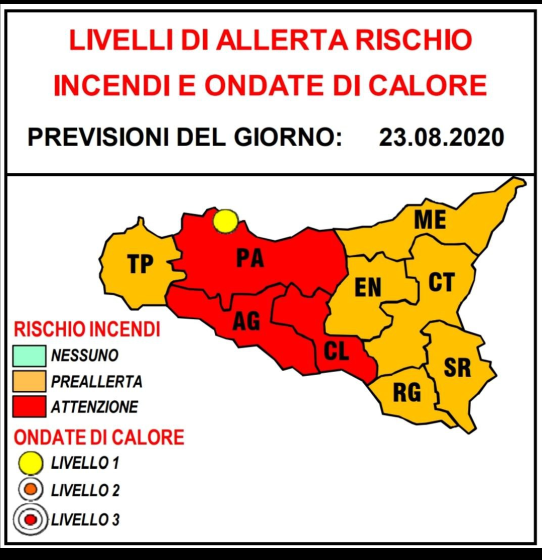 Allerta ROSSA per rischio incendi per il 23 agosto anche nella provincia di Palermo. Scende invece al livello uno il livello della ondata di calore, con temperatura massima percepita di 35 gradi