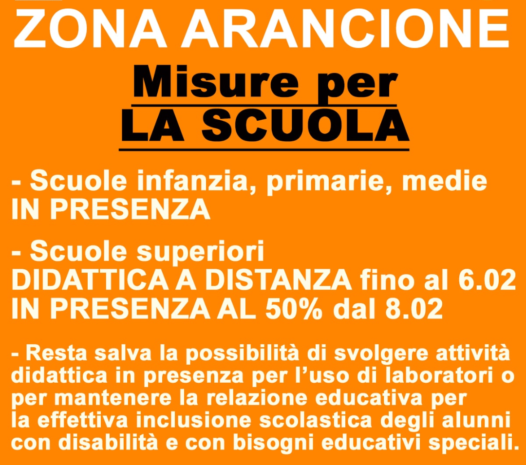 Il provvedimento recepisce la normativa nazionale sulla "zona arancione" all'articolo 2 del decreto del Presidente del Consiglio dei ministri del 14 gennaio e con ulteriori misure aggiuntive. Per le le scuole superiori (attività scolastiche secondarie di secondo grado), fino al 7 febbraio continuerà la didattica a distanza. A partire dall'8 febbraio sarà ammesso alla didattica in presenza il 50 per cento degli studenti delle scuole superiori. Da domani sarà riattivata la didattica in presenza al 100 per cento anche per gli alunni di seconda e terza media. Chi farà ingresso in Sicilia sarà tenuto a registrarsi sulla piattaforma www.siciliacoronavirus.it. Questa misura non è prevista per i pendolari che nei giorni precedenti hanno lasciato l'isola per un periodo inferiore a quattro giorni.