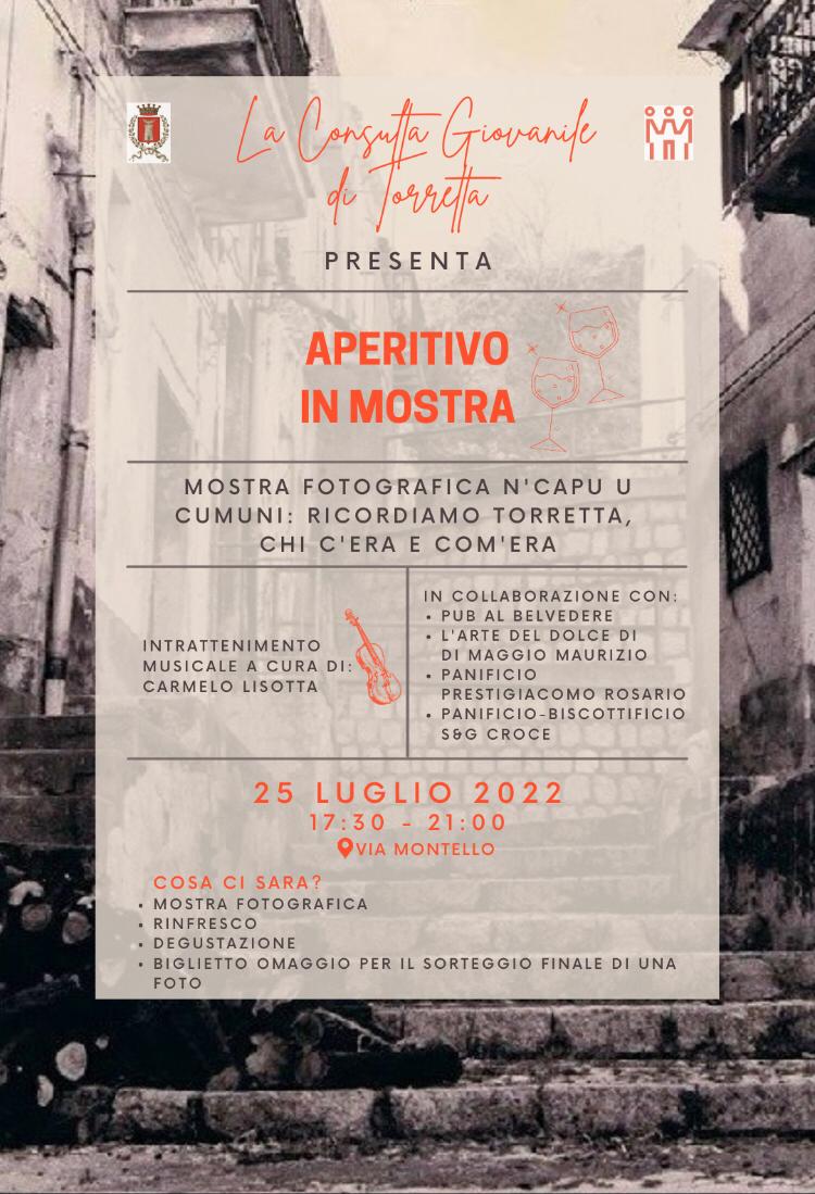Lunedì 25 luglio 2022, singolare iniziativa della Consulta Giovanile di Torretta che ha organizzato un'iniziativa dal titolo "Apertivo in mostra" presso il nostro borgo antico (via Montello). È prevista la "Mostra fotografica n'capu u Cumuni - Ricordiamo Torretta com'era e chi c'era" con un intrattenimento musicale da parte del violinista Carmelo Lisotta ed una degustazione offerta da alcuni sponsor locali. L'iniziativa avrà inizio alle ore 17.30. Per visualizzare la locandina clicca il link in basso.