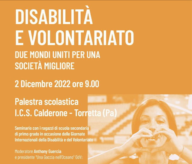 “L’Associazione una Goccia nell’Oceano, in collaborazione con l’I.C.S. Calderone Carini-Torretta, il Comune di Torretta, la Parrocchia Maria SS delle Grazie, il CESVOP e il Comitato Italiano Paraolimpico, come nel 2021, ha voluto celebrare, unitamente alla Giornata Internazionale del volontariato, anche la Giornata Internazionale della Disabilità perché - scrive il Presidente dell’Associazione Antonio Guercia - sono due mondi che uniti non possono far altro che migliorare la nostra società, attraverso delle interconnessioni che fanno concretizzare azioni forti, libere e solidali capaci di arricchire il mondo in cui viviamo”