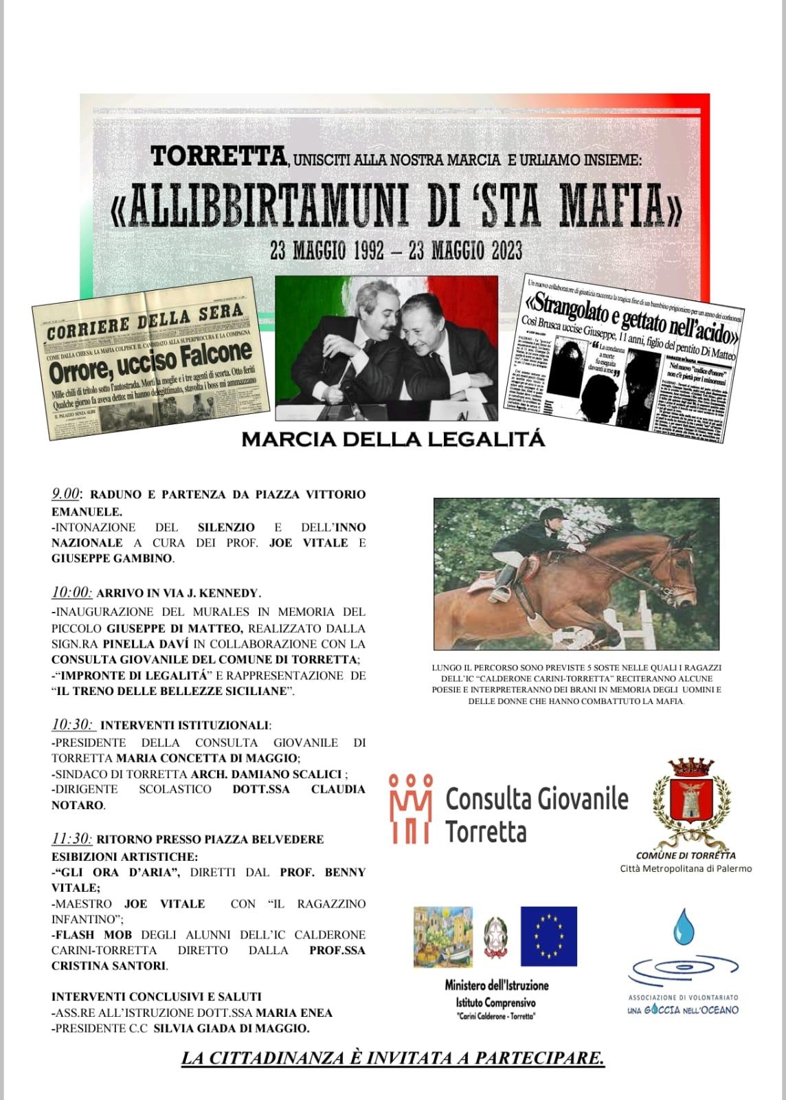 Si svolgerà Martedì 23 maggio 2023, la “Marcia della legalità” organizzata della Consulta Giovanile, dal Comune di Torretta, dall’Istituto Comprensivo Calderone Carini - Torretta e dall’Associazione Una Goccia nell’Oceano, per ricordare il sacrificio di Giovanni Falcone e Paolo Borsellino.