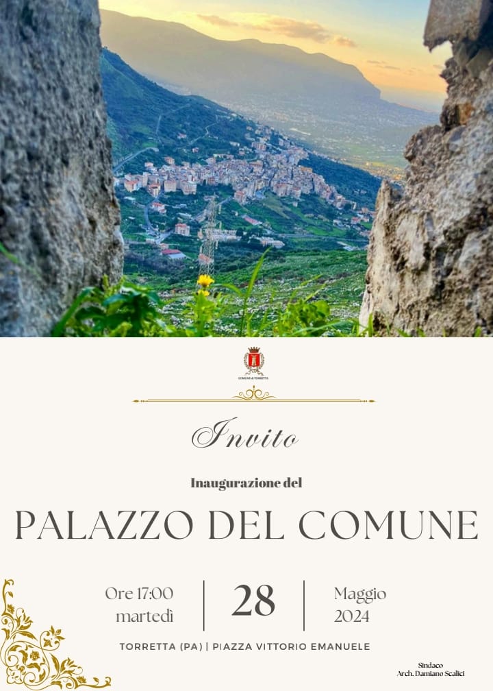 La Cittadinanza è invitata a partecipare all’evento inaugurativo del Palazzo Comunale (riaperto dopo il restauro) che si terrà domani 28 Maggio 2024, alle ore 17.00 in Piazza Vittorio Emanuele n. 29 - Torretta.