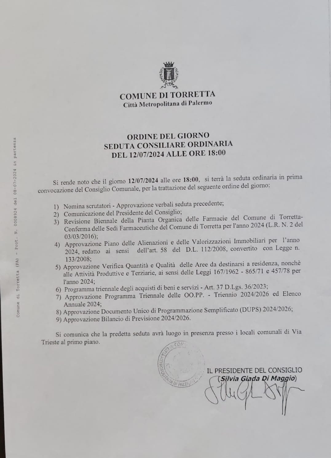 Oggi 12 luglio, alle ore 18.00, nei locali di via Trieste, in seduta pubblica, avrà luogo la seduta ordinaria del Consiglio Comunale. Nel corso della seduta si procederà all'approvazione del Bilancio di Previsione 2024/2026. Per visualizzare l'o.d.g. completo scarica l'alelgato. La Cittadinanza è invitata a partecipare.