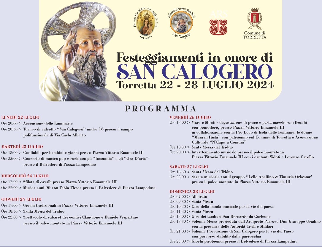 Sono iniziati i Festeggiamenti in onore del nostro Patrono San CALOGERO. Sarà una settimana ricca di eventi musicali: da Fabio Flesca agli Ora d'aria ed agli Insomnia, da Letizia Sidoti e Lorenzo Carollo a Lello Analfino con la Tinturia Orkestar (sabato 27);