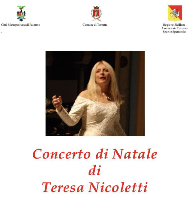 Note e arie della tradizione natalizia. Là mezzosoprano Teresa Nicoletti si esibirà accompagnata da Vito Mandina all’organo e Mirko D’Anna al violino. Tra i pezzi proposti, brani di Caccini, Purcell, Franck, Charpentier, Adam; pezzi della tradizione natalizia e composizioni della stessa Teresa Nicoletti. Il concerto avrà luogo sabato 4 gennaio, alle ore 19.00 in Chiesa Madre a Torretta.