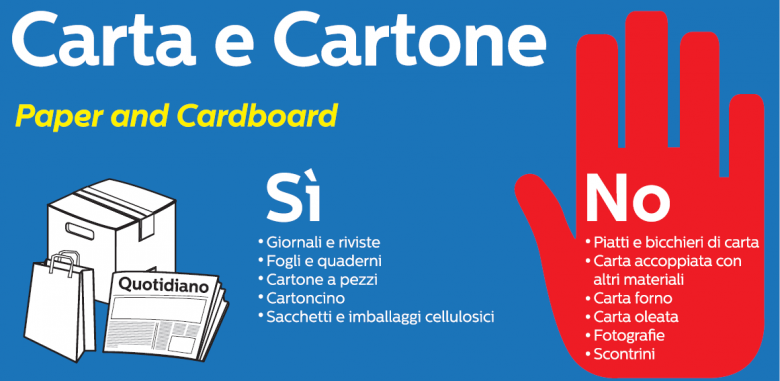 Ciò premesso, si ricorda agli utenti che, nel contenitore della carta, vanno conferiti, oltre alla semplice carta, anche i derivati come i cartoni (scatola della pasta, giornali e riviste, libri quaderni cartoni piegati, imballaggi di cartone, scatole per alimenti, cartone per bevande, contenitori in tetrapak, carta da pacchi pulita, cartoncino, cartone da imballaggio, cartone per alimenti, fogli di carta o cartone, pergamene, riviste, sacchetti di carta, scatola in cartone per pizza pulita, scatoloni, fustino del detersivo).