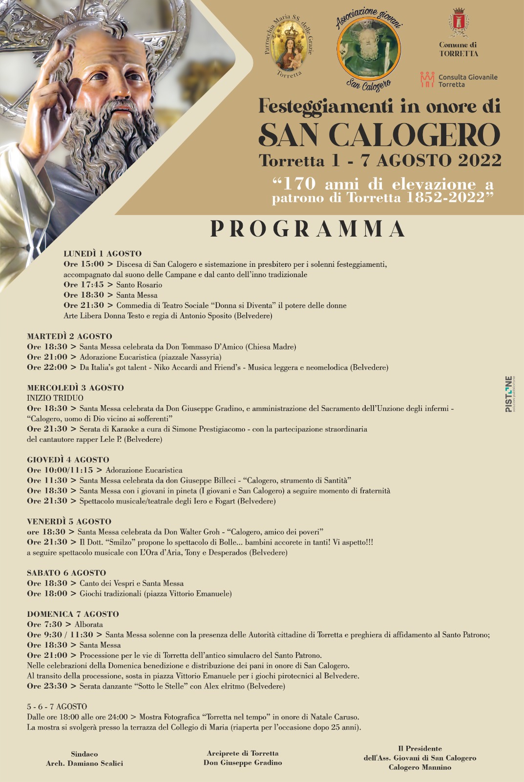 Cliccando il link in basso troverete il programma completo delle celebrazioni religiose che culmineranno Domenica 7 agosto con la Santa Messa alla presenza delle Autorità civili e militare (ore 11.30) e con la Solenne Processione dell’antico simulacro di San Calogero che avrà inizio alle ore 21.00.