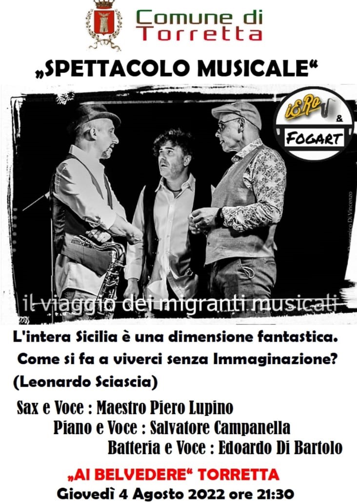 Giovedì 4 agosto, alle 21.30, si esibiranno gli "Iero & Fogart band", con la partecipazione straordinaria del tenore Piero Lupino, che presentano al pubblico "Il viaggio dei migranti musicali".