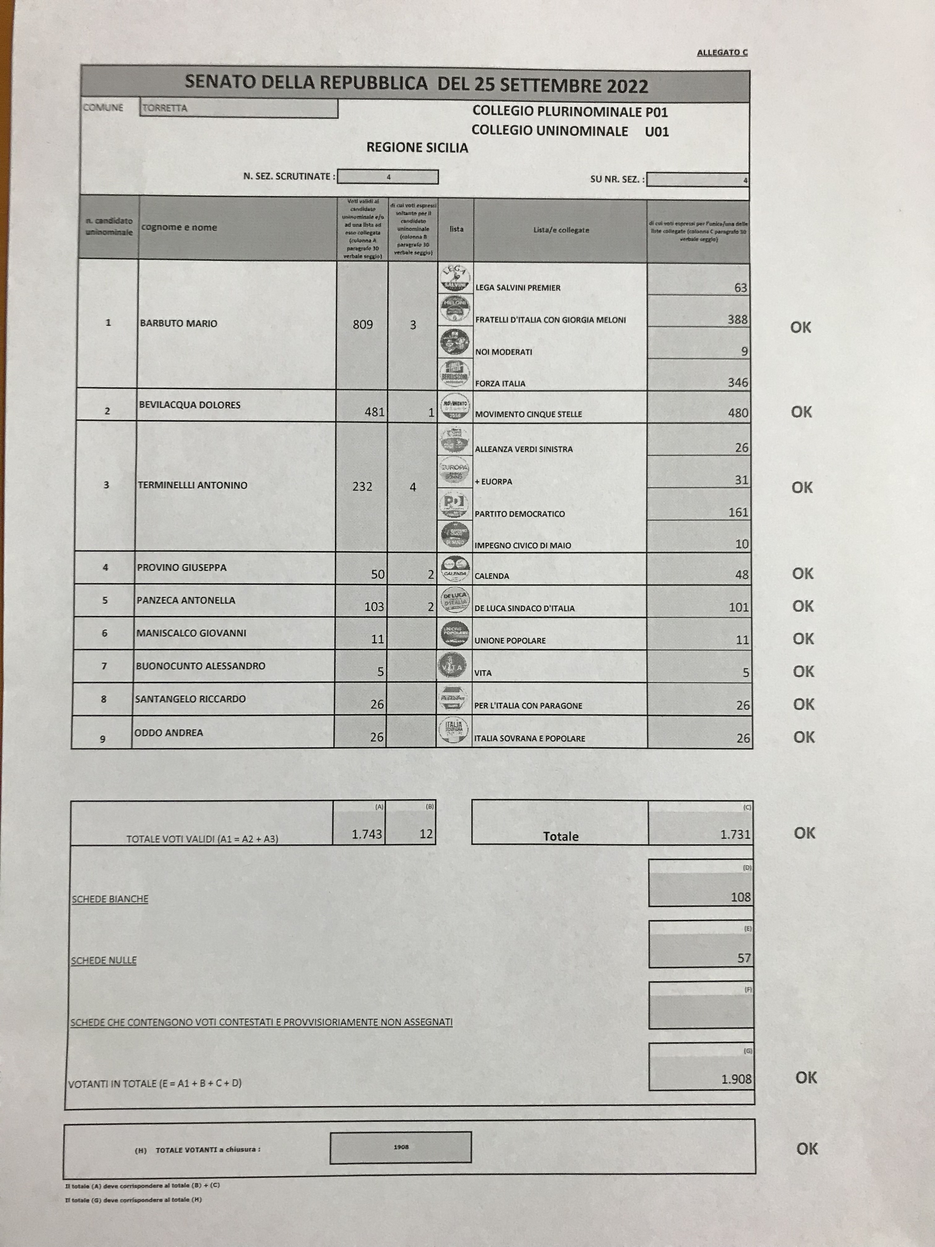 Ecco i risultati delle consultazioni elettorali di ieri relativamente a Torretta
