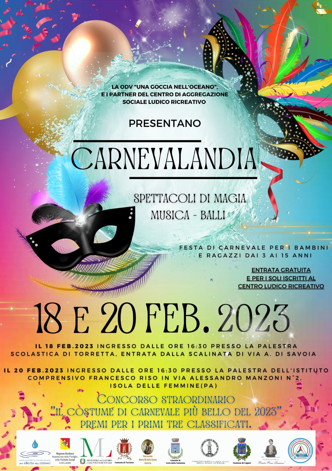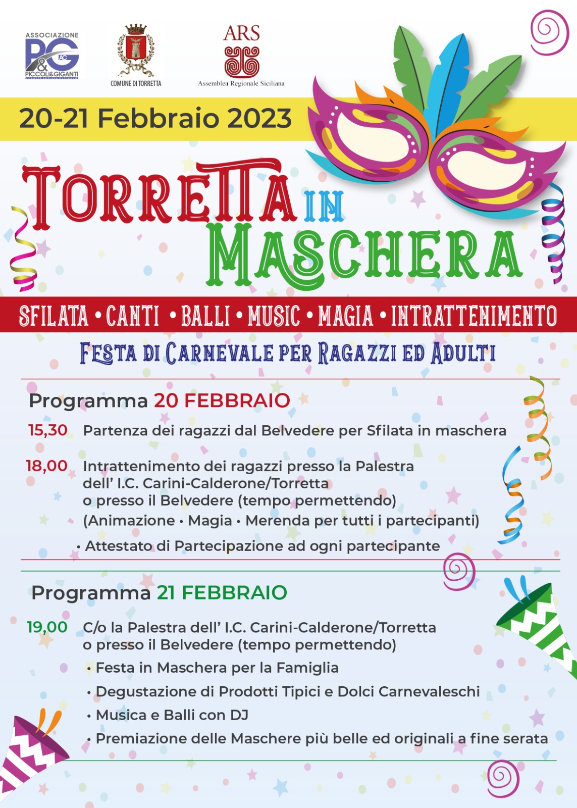 Martedì 21 febbraio, alle ore 19.00 avrà luogo una festa in maschera con degustazione di dolci tipici di carnevale. A seguire musica e balli e premiazione delle maschere più belle ed originali. Gli spettacoli, se lo condizioni meteo lo consentiranno, avranno luogo presso il Belvedere "Francesco Di Maggio". La Manifestazione è organizzata dal Comune di Torretta e dall'Associazione Piccoli & Giganti, con il patrocinio oneroso dell'Assemblea Regionale Siciliana. Con la suddetta delibera il Comune di Torretta ha altresì approvato il programma della manifestazione "Carnevalandia" organizzato dall'Associazione "Una goccia nell'Oceano". In merito a quest'ultima manifestazione, si comunica che l'evento, originariamente programmato per Sabato 18 febbraio, alle ore 16.30, presso la palestra del plesso scolastico S. Giuseppe Maria Tomasi, avrà luogo presso il campo polivalente (ingresso dalle vie Panagulis e Carlo Alberto) con inizio alle ore 15.30. Per visualizzare i relativi programmi clicca sui link in basso.