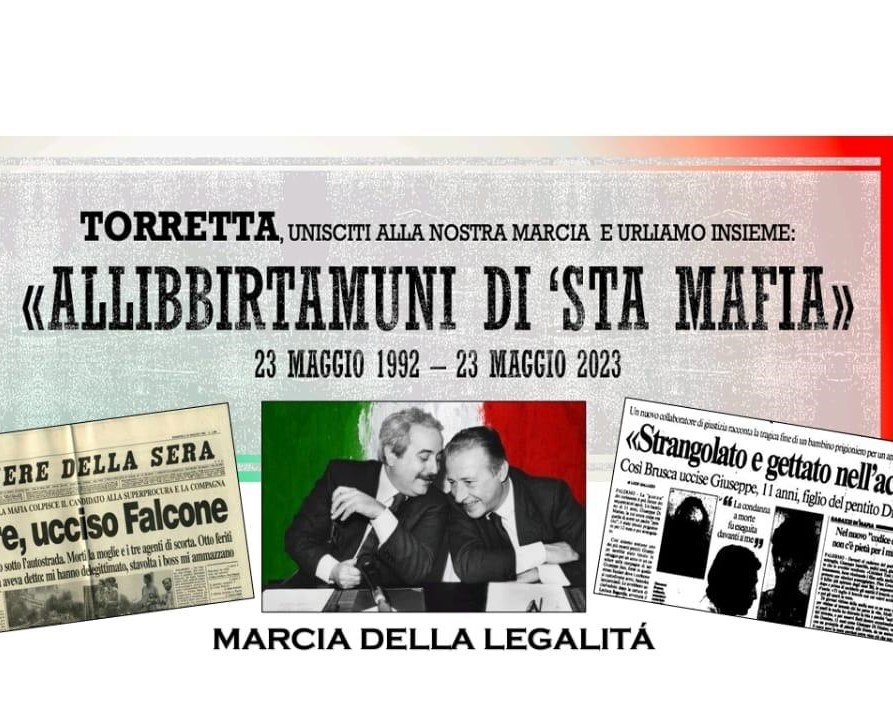 Si svolgerà Martedì 23 maggio 2023, la “Marcia della legalità” organizzata della Consulta Giovanile, dal Comune di Torretta, dall’Istituto Comprensivo Calderone Carini - Torretta e dall’Associazione Una Goccia nell’Oceano, per ricordare il sacrificio di Giovanni Falcone e Paolo Borsellino.